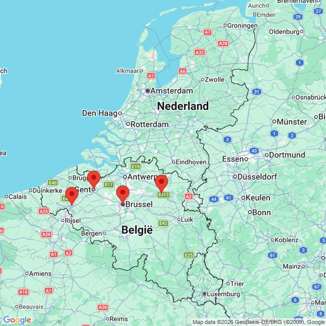 Antwerpen, Brussel, Gent, Kortrijk en Lummen.