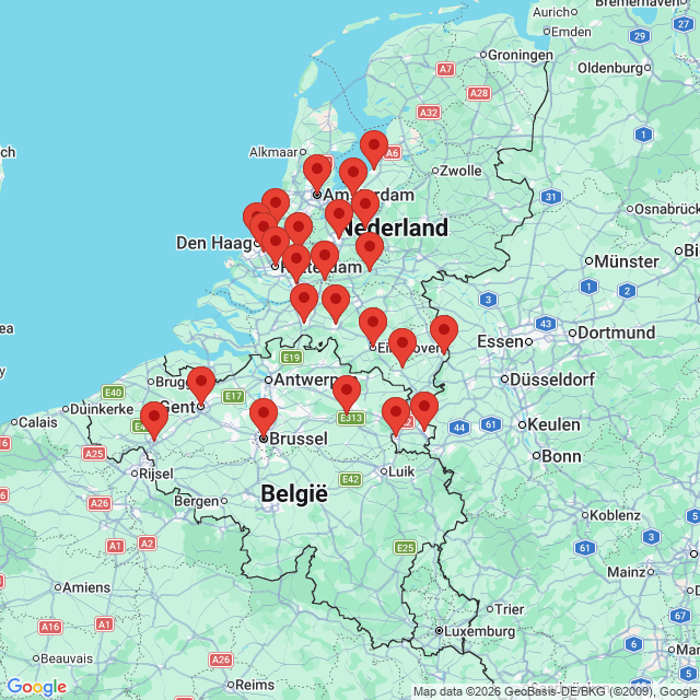 Almere, Amersfoort, Amsterdam, Antwerpen (BE), Breda, Brussel (BE), Delf, Den Haag, Dordrecht, Eindhoven, Gent (BE), Gorinchem, Gouda, Heerlen, Kortrijk (BE), Leiden, Lelystad, Lummen (BE), Maastricht, Nederweert, Rotterdam, Stein-Urmond, Tiel, Den Bosch, Tilburg, Utrecht en Venlo.